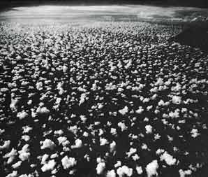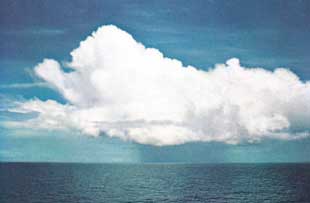 3) Stacking: When the small clouds join together, updrafts within the larger cloud increase. The updrafts near the center of the cloud are stronger than those near the edges.2 These updrafts cause the cloud body to grow vertically, so the cloud is stacked up (see figures 19 (B), 20, and 21). This vertical growth causes the cloud body to stretch into cooler regions of the atmosphere, where drops of water and hail formulate and begin to grow larger and larger. When these drops of water and hail become too heavy for the updrafts to support them, they begin to fall from the cloud as rain, hail, etc.3